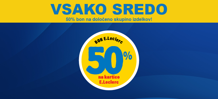 POGOJI: Vsako sredo ob nakupu izdelkov določene skupine prejmete 50% bon na kartico E.Leclerc. Velja za nakup največ 25 kosov izdelkov, ki so vključeni v to posebno sredino ponudbo. V primeru, da stranka kupi več kot 25 izdelkov, vključenih v to ponudbo, se 50% bon E.Leclerc upošteva za najdražjih 25 izdelkov, za preostanek izdelkov stranka ne prejme bona E.Leclerc. Boni E.Leclerc se ne seštevajo, upošteva se višji bon.